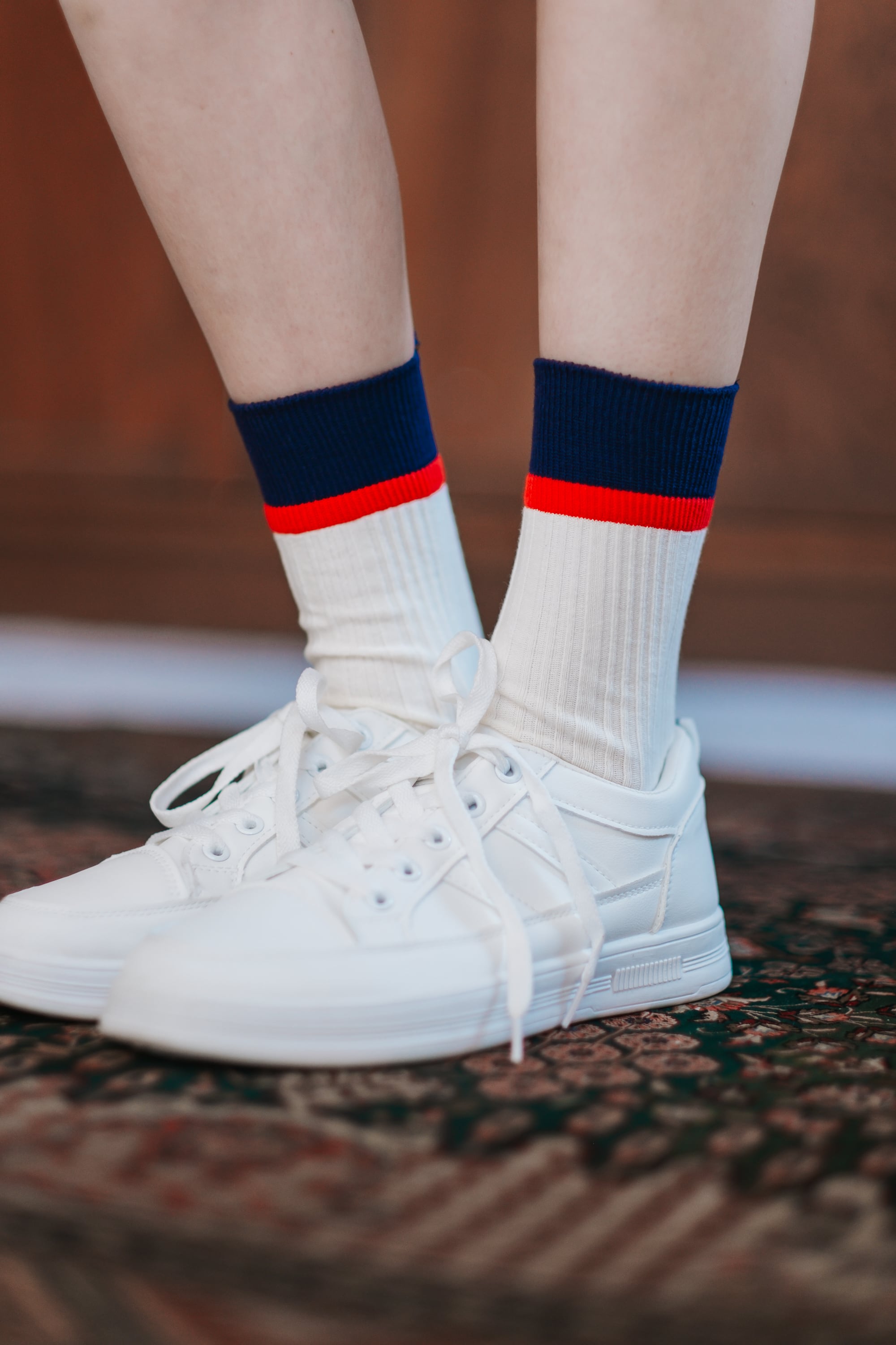 配色ラインがスタイリングのアクセントになるリブソックス。